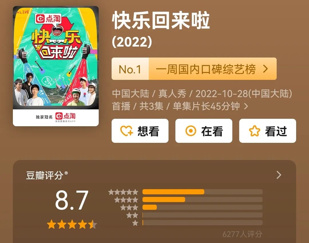 相比之下,0713再就业男团在芒果TV推出的《快乐回来啦》则口碑好很多,这档节目准确的说是点淘APP的客户定制节目,但是在豆瓣上却能拿到8.7的高分,这与再就业男团的真人秀真实感,以及节目中相对融合的软植入有着密切的联系。