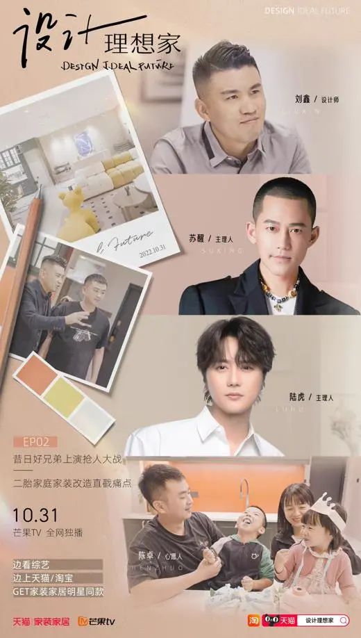 除了上述的与点淘合作的《快乐回来啦》,芒果TV还和天猫家装家居联合打造了聚焦家庭装修热点及痛点的家装设计明星经营类真人秀综艺节目《设计理想家》,相似的是,这档节目中也选择了0713男团的成员苏醒和陆虎。