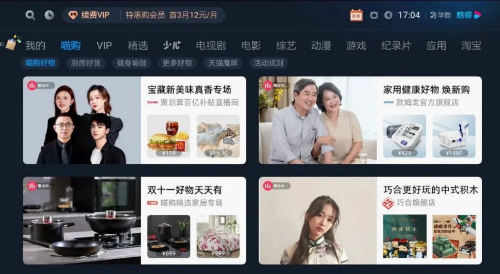 在购物方面,优酷上线了购物平台喵购频道,依托阿里生态优势,联合天猫供应链体系中的12个行业,打造适合大屏用户的好货特价独享平台。