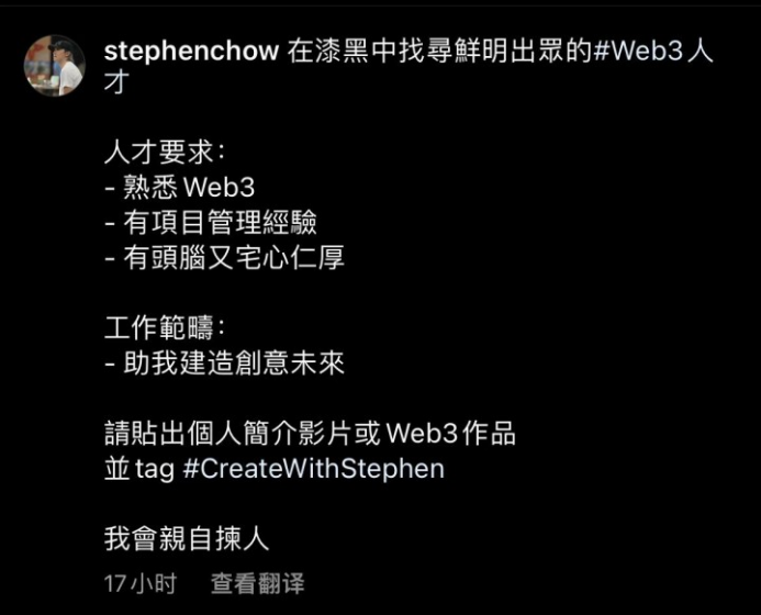 而在10月18日,周星驰还曾在Instagram上公开“请人”招聘Web3人才,写道:“在漆黑中寻找鲜明出众的Web3人才。人才要求:熟悉Web3,有项目管理经验,有头脑又宅心仁厚。工作范围:助我建造创意未来。”应聘者需要提交个人简介影片或者Web3作品,周星驰还表示会亲自选人。