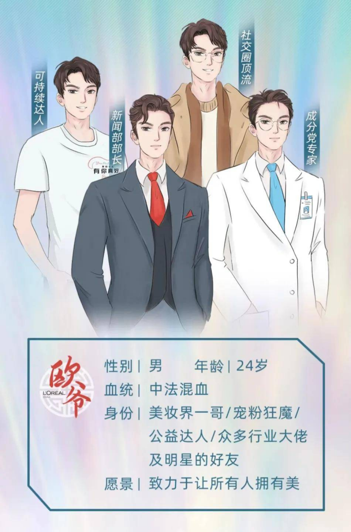 随后,欧莱雅又上线了首个有中国血统的虚拟偶像“欧爷”作为品牌代言人,其年龄设定 24 岁,中法混血,有美妆一哥、宠粉狂魔、公益达人等身份标签,愿景是致力于让所有人拥有美。