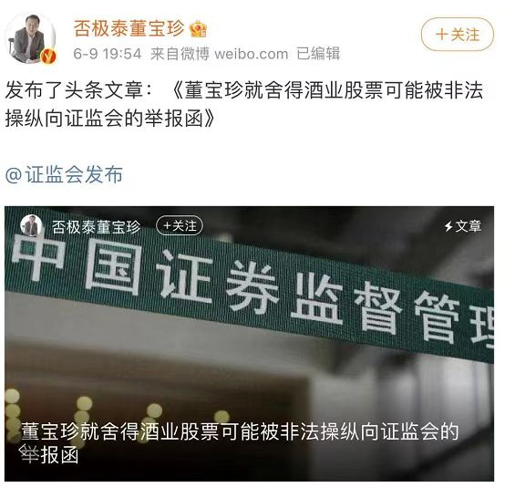 2021年6月9日,知名白酒投资人董宝珍曾于微博“公开举报”舍得经销商大规模囤货,以操纵公司股价。