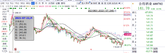截至2022年11月7日收盘,舍得酒业股价141.7元/股,距去年7月22日最高点266.01元,已跌去近47%。