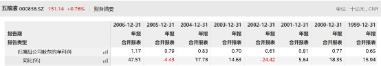 1998年-2006年五粮液归属母公司净利润,来源:五粮液公司年报,wind