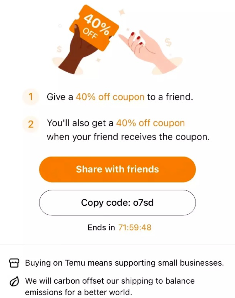 当然流量裂变的推广模式依然在进行,用户只要将链接分享给朋友,双方都能享受40%的折扣,这有一点类似于国内好友拼单的模式。