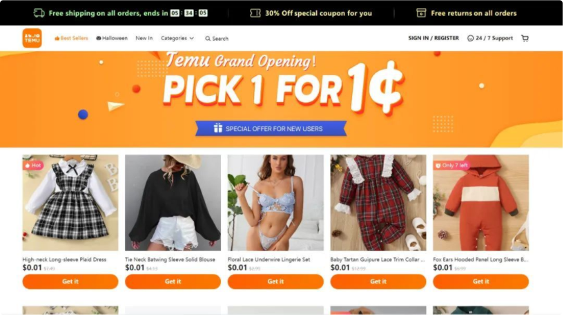 各种补贴政策让人眼花缭乱。Temu网站上包含了14个类别的产品,包括服装、配饰、宠物用品和美容产品,并且为首次购物者提供30%的折扣,订单达到或超过49美元则会包邮并且不时也有限时的无门槛包邮活动,同时允许90天内无条件退货。