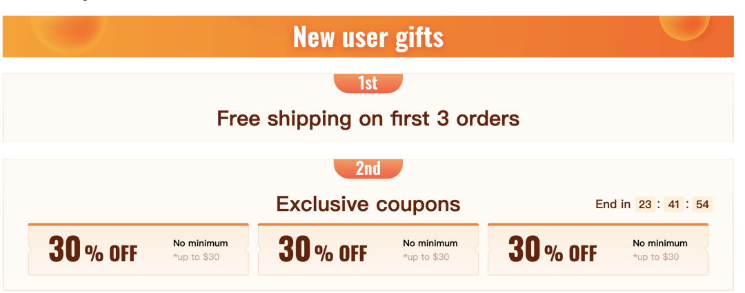 在Temu的打折区上,不少产品价格都在0.9美元以下,比如0.48美元一个抓夹、0.34美元一套美甲贴、0.69美元一个护肤品小瓶子,加上新用户优惠券,说是白送也不为过。新用户30%的折扣力度也并不是极限,现在临近美国市场最重要的黑五,最近不少商品的活动折扣也都高达70%。