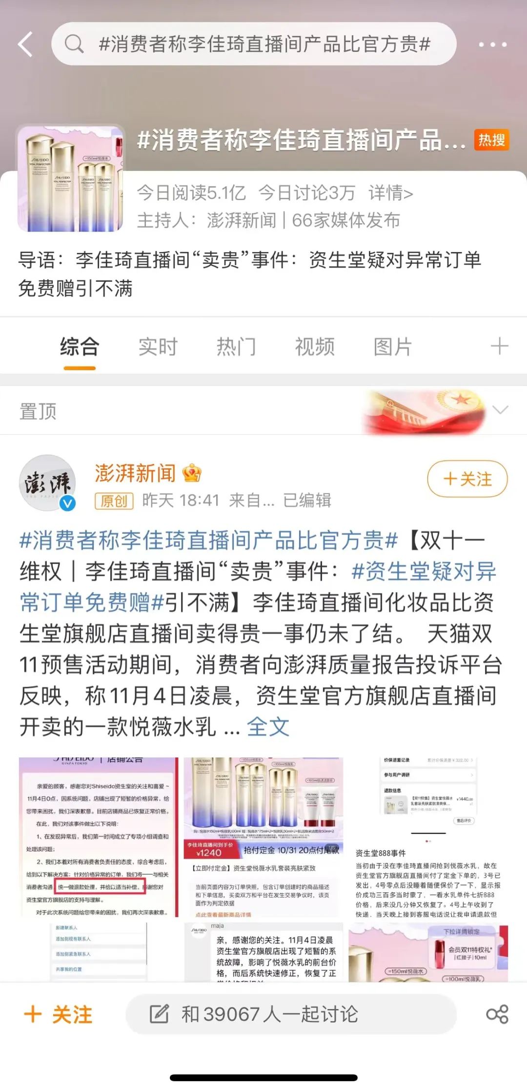 11月8日,话题#消费者称李佳琦直播间产品比官方贵#登上微博热搜第一,截至发稿已有5.1亿阅读量。