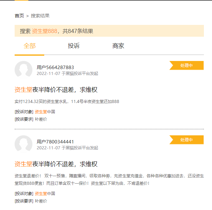 美妆头条记者发现在黑猫投诉平台输入“资生堂888”关键词,共显示出847条结果,主要投诉内容为资生堂直播间半夜降价、下架链接无法保价,以及要求补差价或退款。
