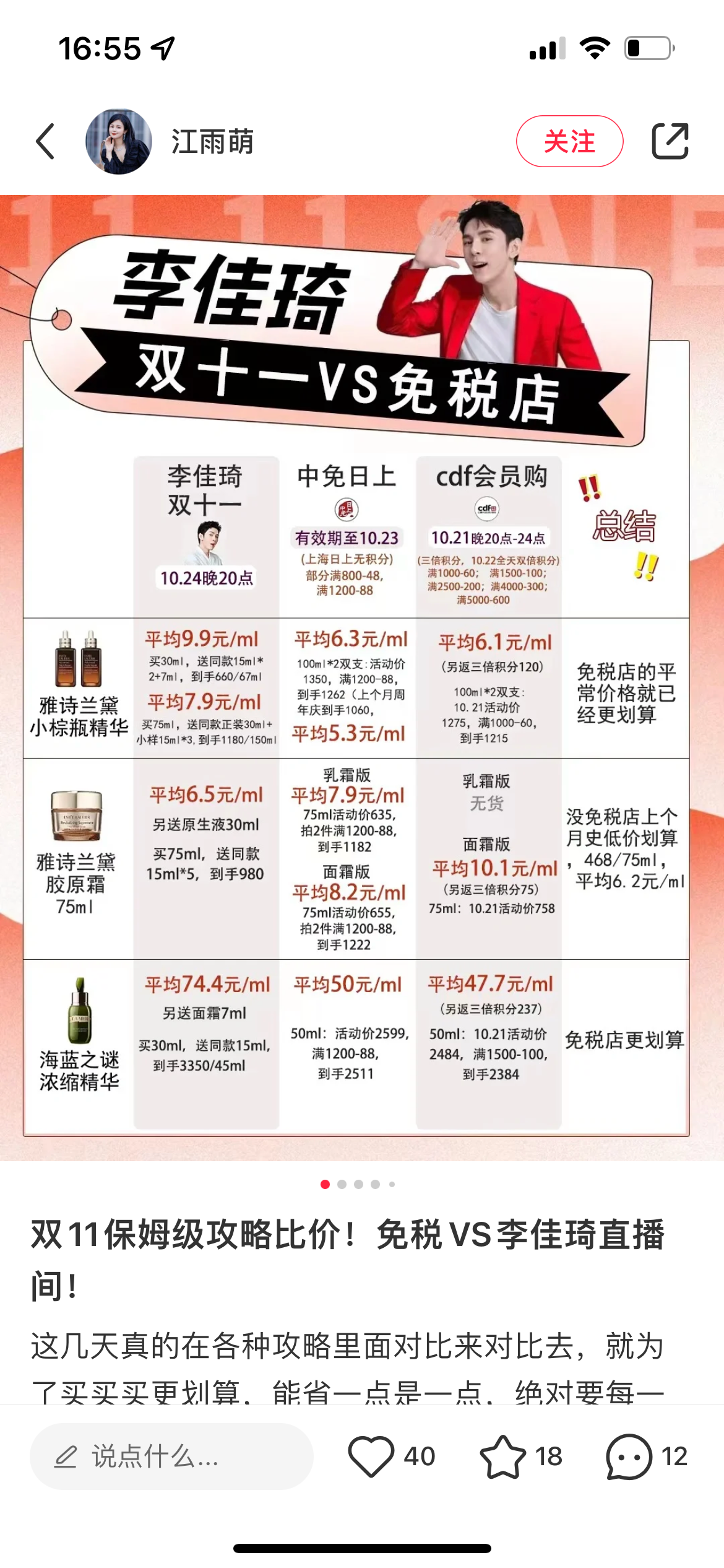 在网友“江雨萌”发布的“免税VS李佳琦直播间”笔记中,其按照产品每毫升的单价对比,发现李佳琦直播间的价格赶不上免税店的日常价格。比如,“海蓝之谜浓缩精华”在李佳琦直播间为74.4元/ml,而在免税店只要50元/ml。