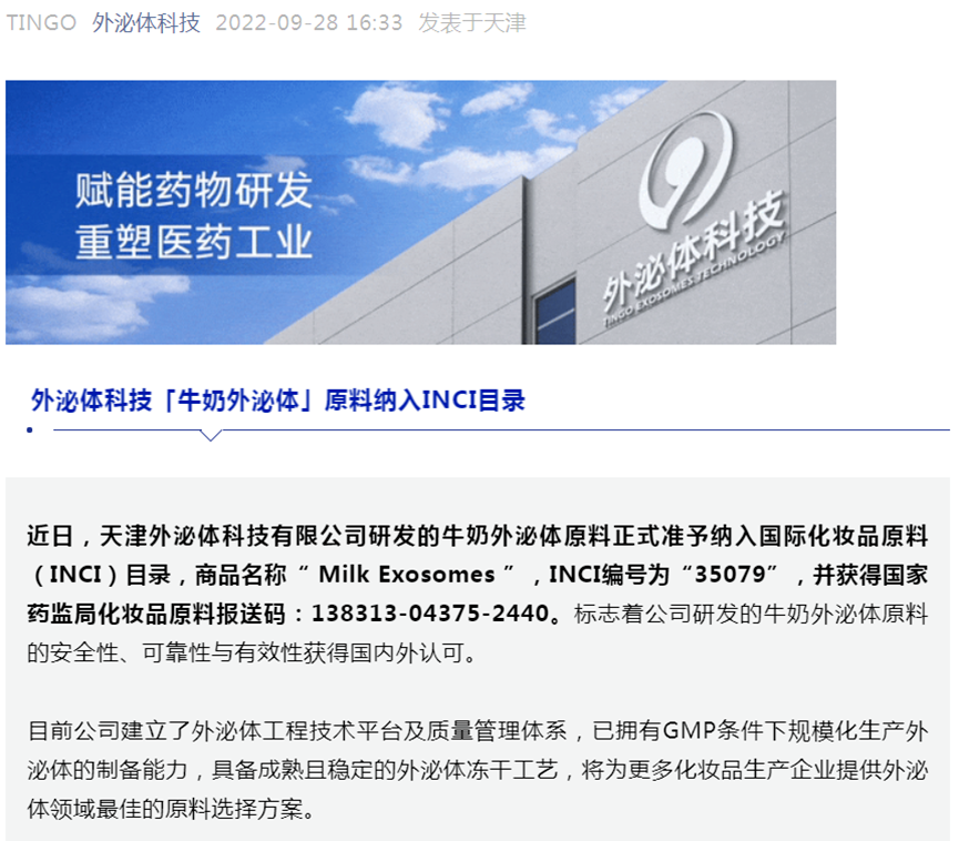 譬如,9月份,天津外泌体科技有限公司旗下微信公众号“外泌体科技”发文称,“公司研发的牛奶外泌体原料正式准予纳入国际化妆品原料(INCI)目录,商品名称“ Milk Exosomes ”,INCI编号为“35079”,并获得国家药监局化妆品原料报送码:138313-04375-2440,标志着公司研发的牛奶外泌体原料的安全性、可靠性与有效性获得国内外认可。”