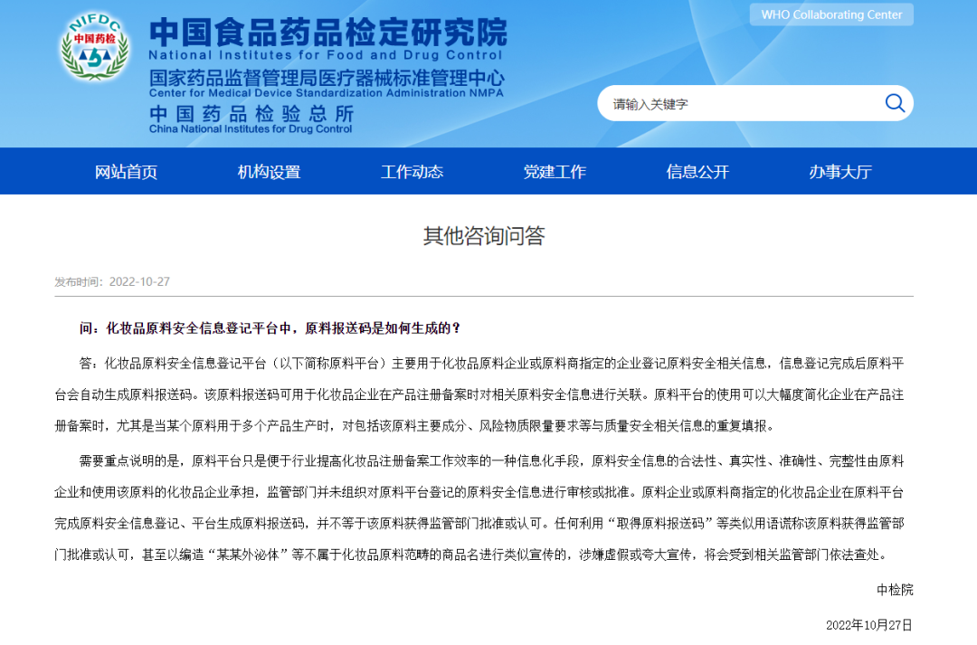在化妆品原料报送码的生成及其相关问题进行解答中,中检院明确提到:“原料安全信息的合法性、真实性、准确性、完整性由原料企业和使用该原料的化妆品企业承担,监管部门并未组织对原料平台登记的原料安全信息进行审核或批准。”