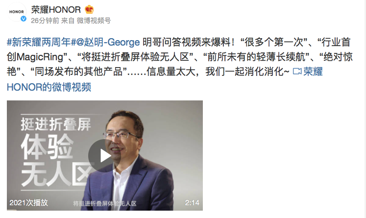 值得注意的是,荣耀官方宣布将在11月22日至23日期间举办荣耀MagicOS暨旗舰新品发布会,结合最新发布的CEO赵明问答视频,可推测即将发布的旗舰新品或将为新一代折叠屏。消息一出,引起外界高度关注,赵明更直言称新一代折叠屏将“挺进折叠屏体验无人区”。