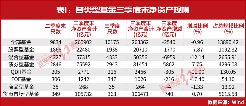 据基金三季报相关数据显示,国内190家公募基金公司旗下披露三季度的基金总数为10175只。这1万多只基金的三季度末的净资产合计26.34万亿,而二季末时净资产合计26.59万亿,相比之下,三季度国内公募基金整体规模减少了2540亿元,减少比例不到1%。