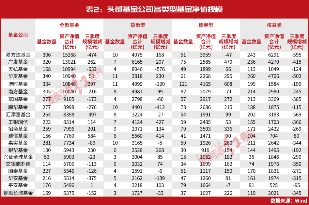 当上市公司三季报和基金三季报均落下帷幕,基金业的整体变化也正式定格。据了解,公募基金三季度的净资产相比二季度有一定减少,但减少幅度不大。从权益类基金而言,头部基金公司的权益类规模出现普遍下滑,惟一不同的是建信基金,该基金的权益类规模保持增长。