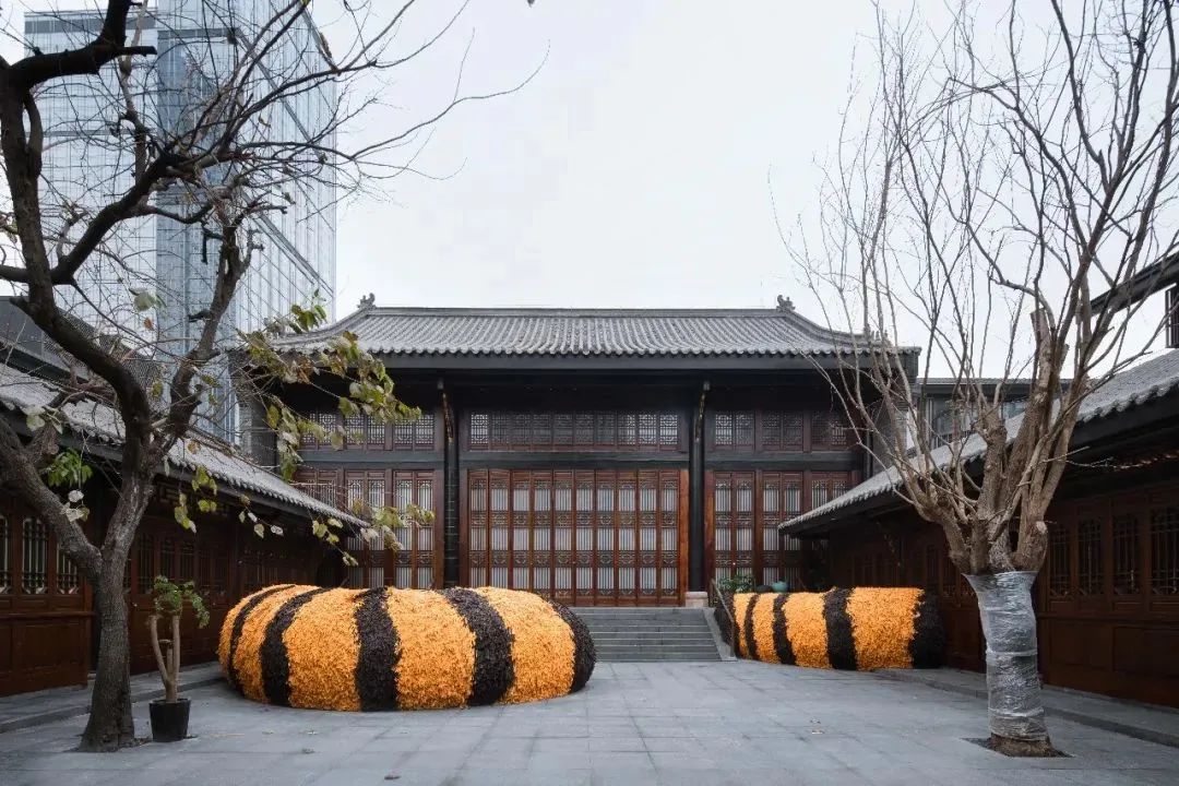 餐厅装修整体保留了广东会馆的风格,Louis Vuitton在会馆入口处两旁设置了绿植、熊猫、热气球装置,院落内也用绿植打造了一片花园,花丛中设有一个熊猫乘坐热气球的装置,通过这样的方式致意品牌的旅行基因以及成都当地特色文化。