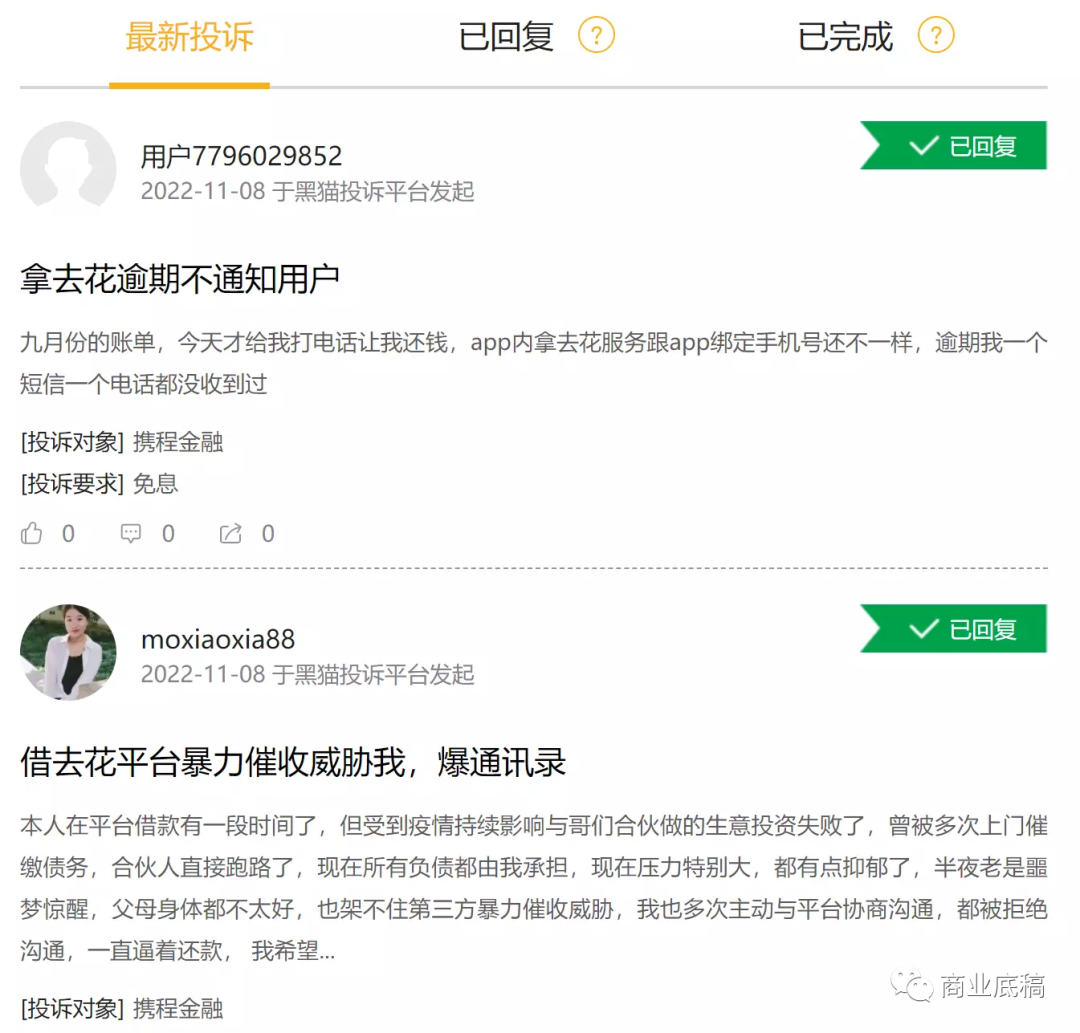 还的上,你是上帝。还不上,你就是敌人。在黑猫投诉上,携程金融暴力催债、提供不合规网贷产品也成为携程金融投诉的重灾区。