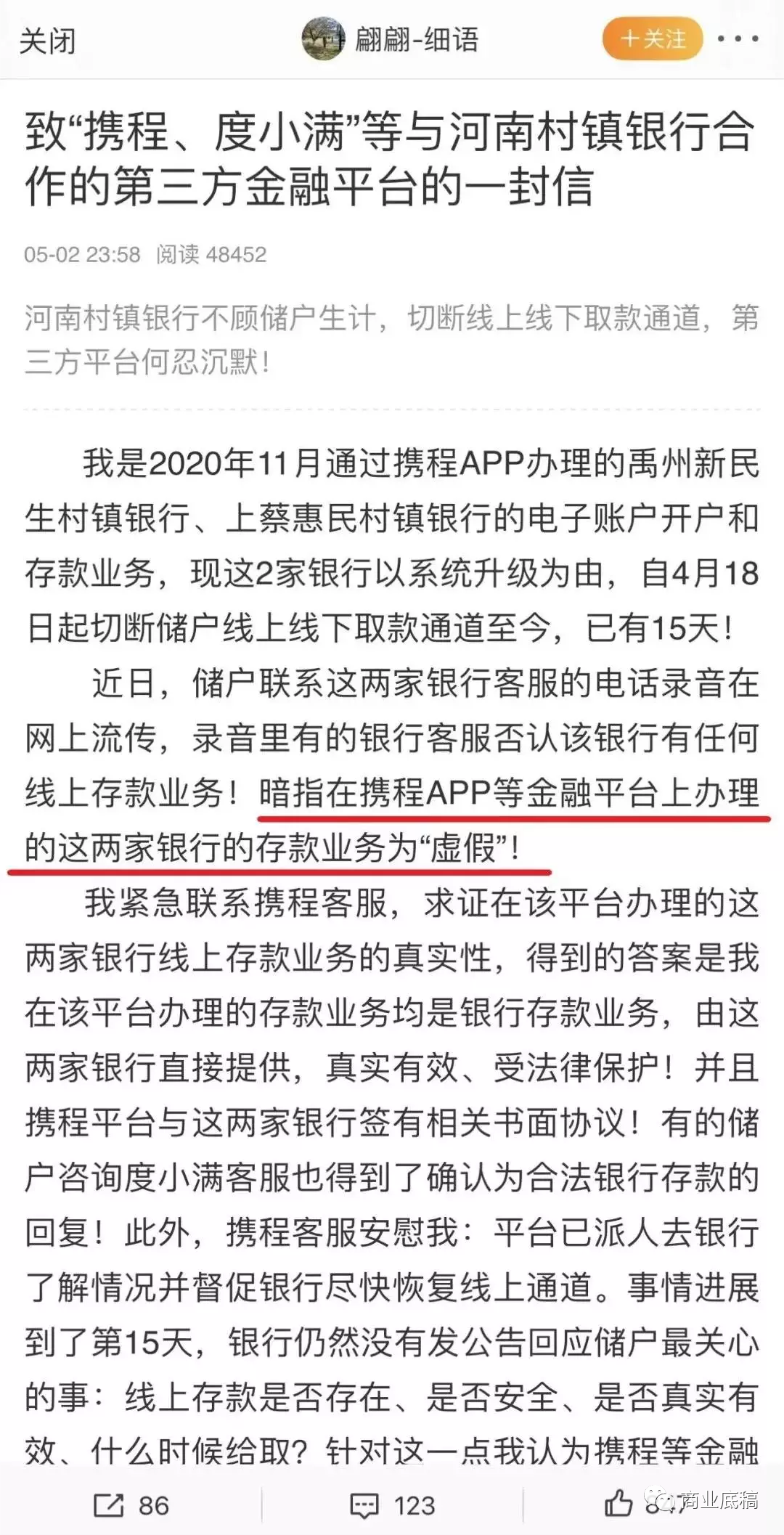 今年5月2号,微博网名为翩翩-细语的一名受害者发布了一封公开信,名为《致“携程、度小满”等与河南村镇银行合作的第三方金融平台的一封信》。作为第三方引流的携程金融,面对村镇银行取款出现问题,却始终未有大的公开举动。
