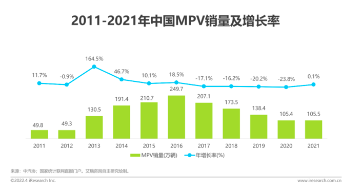 与此同时,随着动力电池的续航能力不断扩展,用户对于MPV的电动化的接受程度也越来越高。2021年,纯电动MPV销量增速达到185%,远高于MPV市场总体0.1%的增速。对此,艾瑞在一份报告中指出,现阶段家用MPV正朝着智能化、网联化、高端化、节能化、年轻化的方向升级。