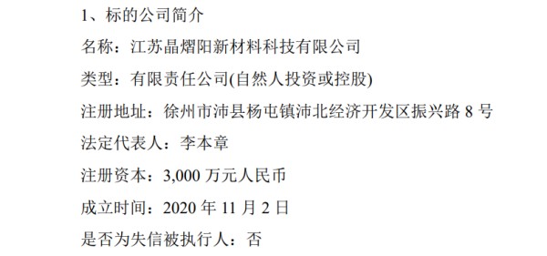 标的公司晶熠阳成立至今仅两年时间,处于光伏行业上游单晶硅产业链,主要产品光伏石英坩埚是太阳能级单晶硅棒硅片的生产和辅助材料的配套产品。