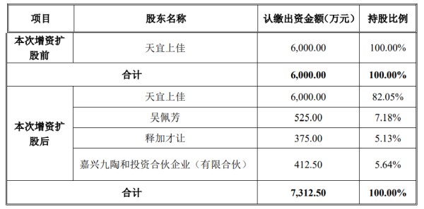 公告显示,天宜上佳的关联自然人吴佩芳、释加才让以及关联法人嘉兴九陶和投资合伙企业(有限合伙)(以下简称“嘉兴九陶和”)分别以1050万元、750万元、825万元向天宜上佳全资子公司北京天仁道和新材料有限公司(以下简称“天仁道和”)增资,同时,天宜上佳作为现任股东,放弃本次天仁道和增资扩股的优先认购权。本次天仁道和增资扩股完成后,天宜上佳持有天仁道和的股权比例由100%下降至82.05%。