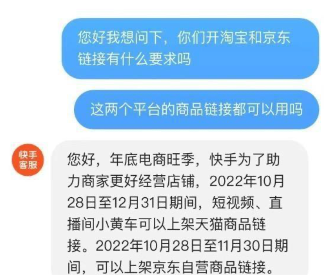 合作的保质期,或许也只有一两个月。快手客服在向商家和主播的回复中表示,为了助力商家更好经营,年底电商旺季,2022年10月28日至12月31日期间小黄车可以使用天猫商品链接;10月28日至11月30日可以使用京东自营商品链接。也就是说,在双十一结束后之后是否还会继续合作,还是个未知数。