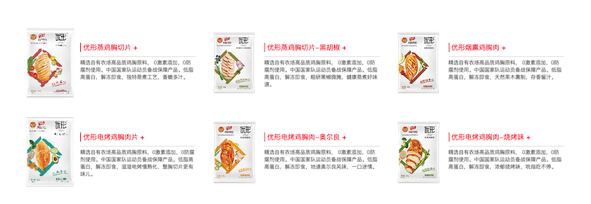 “优形”,是凤祥股份在2017年推出的即食鸡胸肉品牌,目前拥有沙拉鸡胸肉、鸡胸肉蛋白棒、一口不忍肠等即食鸡胸肉产品。目前,优形系列产品已进入中国一线城市的约3万家便利店与精品商超销售,同时在天猫和京东均开设有品牌旗舰店。