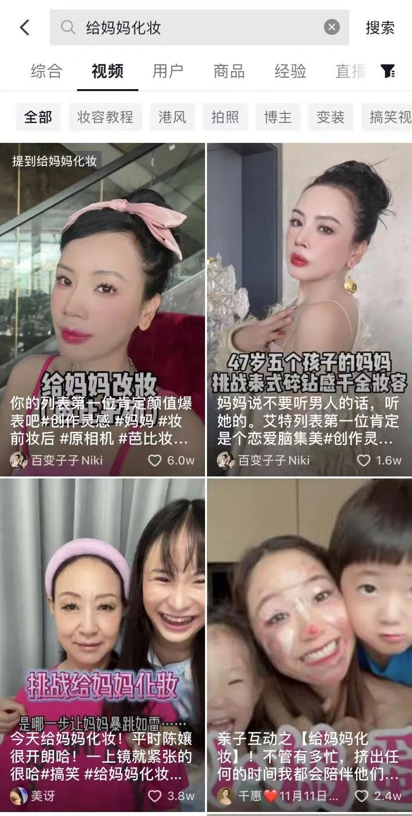 双11前夕,抖音#给妈妈化妆#话题爆火,视频中的女儿通过年轻人的化妆手法给妈妈进行妆容升级,通过粉底和遮瑕遮盖皱纹均匀肤色,修容和腮红修饰面部轮廓提亮气色,不少“妈妈辈”网友还被视频中的产品种了草。