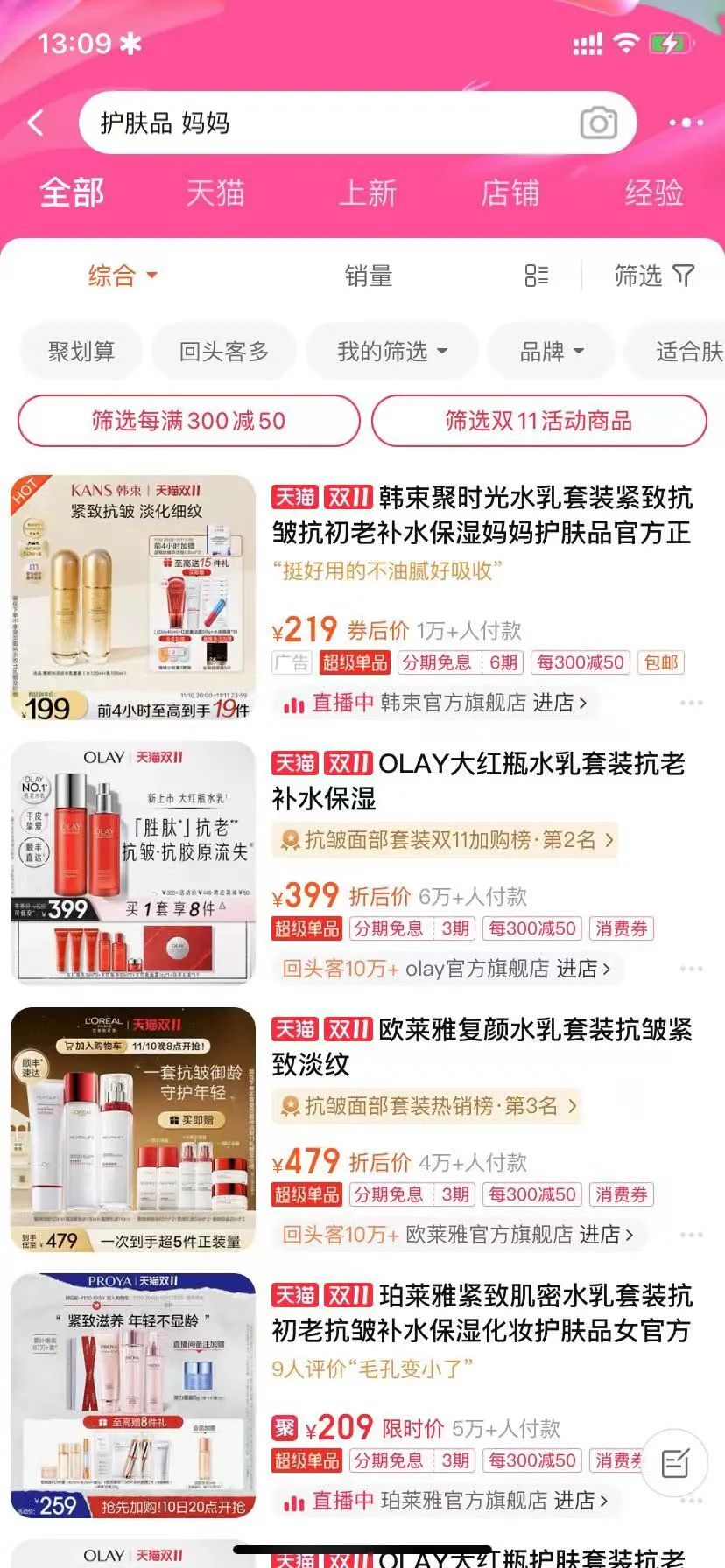 在天猫搜索“护肤品、妈妈”关键词,推荐产品功效以主打补水保湿、淡化细纹提亮肤色的知名口碑大牌套装为主,适用于全年龄段有抗老需求的消费者。