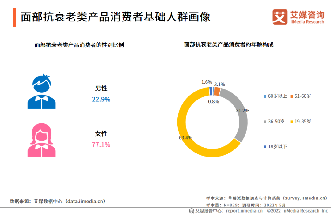但是,根据艾媒报告中心数据统计分析,我国面部抗衰老类护肤品的消费者大部分为女性和90后、00后的年轻群体,50岁以上消费者仅占3.9%。