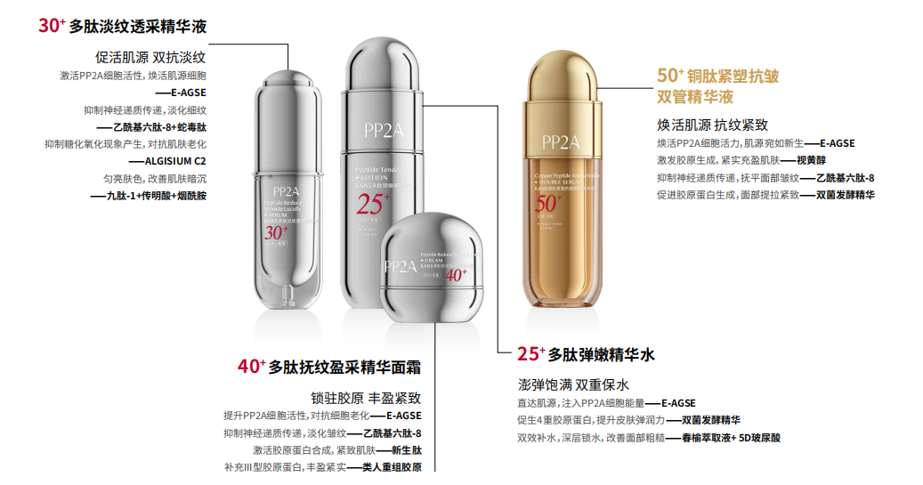其实,国内新锐美妆品牌也开始关注到中老年消费市场。比如PP2A提出的分龄定制、靶向抗衰的品牌定位,首次将品牌以年龄作为系列划分,针对25+到50+不同年龄段的用户提供不同的抗衰解决方案。这对中国中老年美妆市场的发展也提供了一些思路。