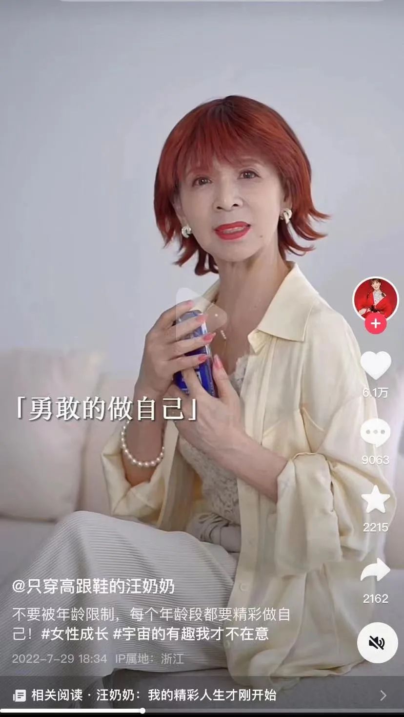 在短视频平台上,现有不少中老年网红在开展美妆知识的科普以及带货,她们用化妆品传递美丽与时尚无惧年龄的价值观。“美丽优雅无关年龄,谁说老年人就不能优雅、不能美丽、不能化妆穿高跟鞋”这就是汪奶奶人设透露出来的观点。