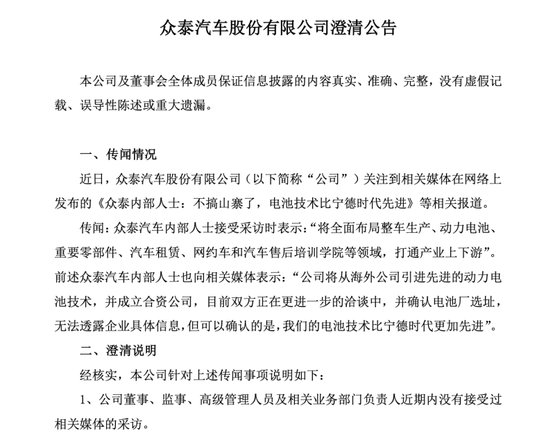 11月7日,众泰汽车发布澄清公告,回应此前网络上发布的《众泰内部人士:不搞山寨了,电池技术比宁德时代先进》等相关报道。