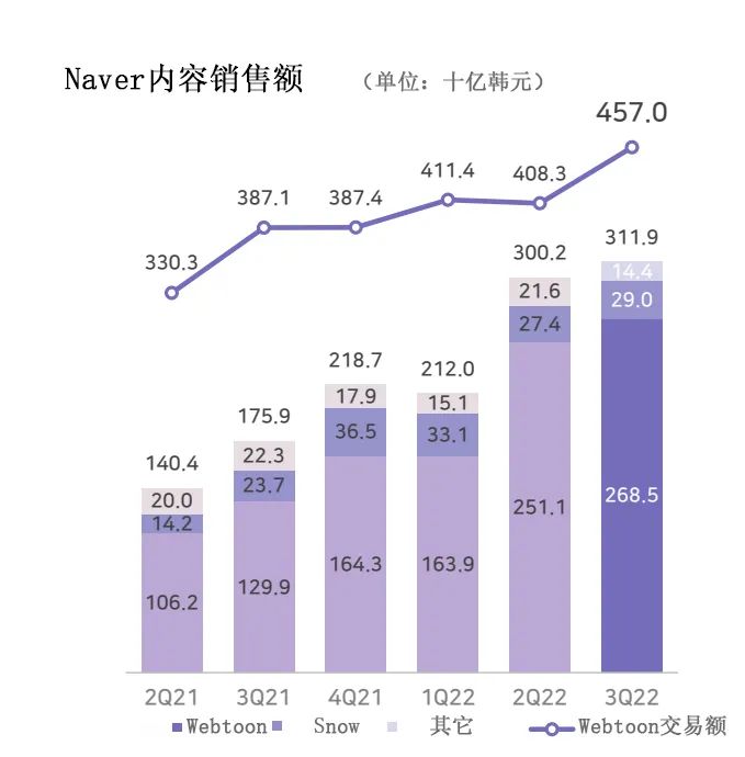 从财报来看,Naver的内容部门仍存在着营业亏损,第三季度的营业亏损为1047亿韩元,具体到Webtoon业务的亏损金额则未公开,Naver表示内容部门的亏损与围绕网漫等相关业务在北美、欧洲以及日本等地区的拓展所花费的大量营销费用有关,例如为了确保网络漫画事业的全球市场竞争优势,Naver在第三季度投入了2224亿韩元(11.6亿元)的营销费用,同比增长了30%。