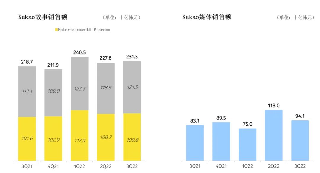 包括Piccoma、Kakao Page、Kakao Webtoon等在内的故事版块销售额为2312亿韩元(12亿元),同比增长6%。其中Piccoma销售额为1215亿韩元(6.4亿元),同比增长4%,kakao Entertainmen销售额则为1098亿韩元,同比增长8%。