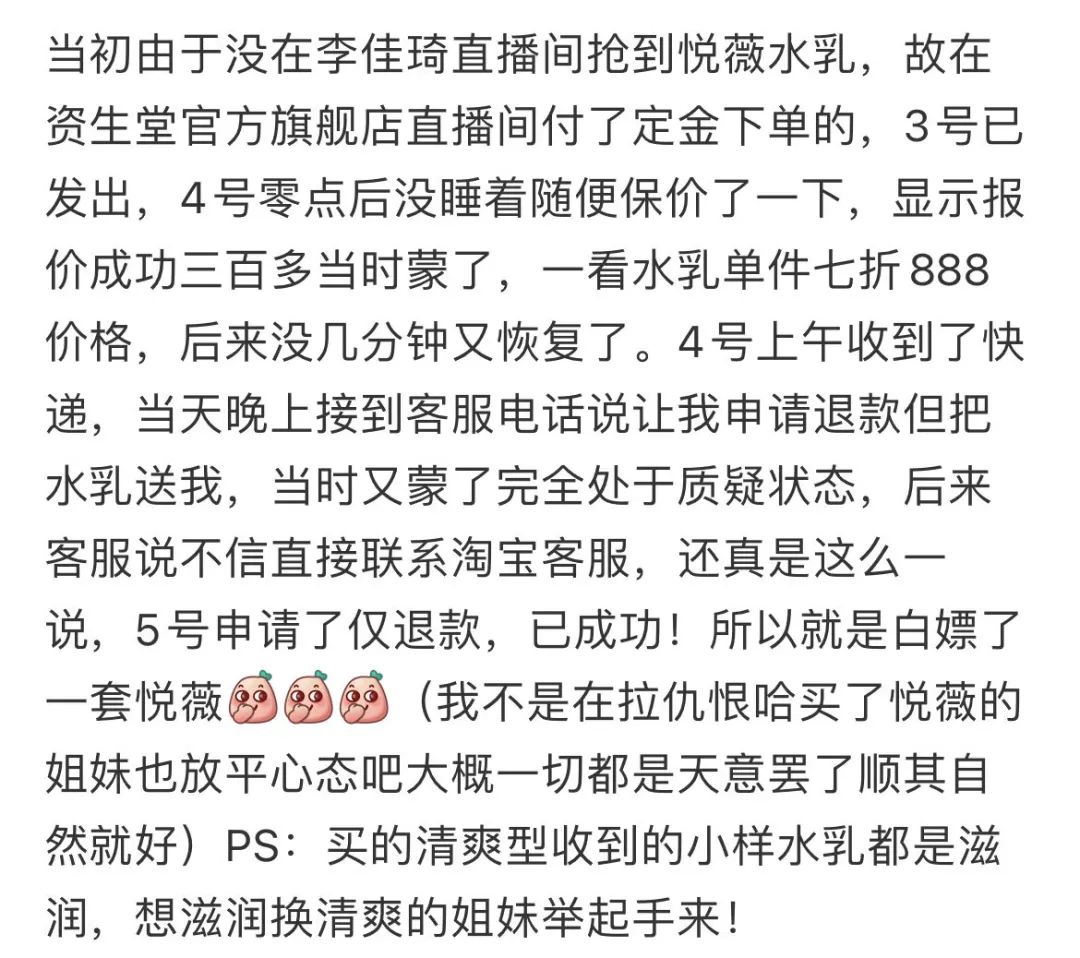 资生堂官方承诺统一做退款处理,并给以适当补偿