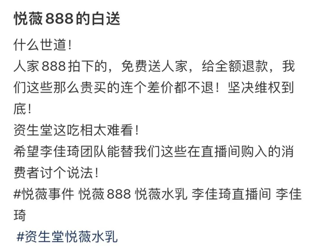 对此,不少网友说道:“资生堂就算补偿免费赠送商品,也要抓紧下架888元链接,这是为了防止李佳琦粉丝价保。否则李佳琦几十万的粉丝订单都申请价保的话,这个损失远远大于他们补偿一批水乳。”目前小红书等社交平台上,不少消费者表示:没有及时申请到价保,我们将联合维权。