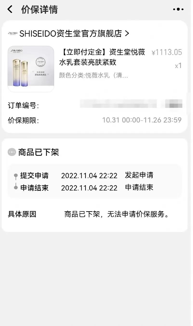 然而11月4日凌晨,有消费者反映称,资生堂官方旗舰店直播间开卖的一款悦薇水乳套装只需888元,比李佳琦直播间的同款商品到手价便宜300元+。部分在李佳琦直播间购买该套装的消费者发现这一情况后,第一时间申请了保价并获得了差价退补。但也有消费者反映,当天资生堂旗舰店已经下架了该商品直播链接,系统显示“无法提供保价服务”。