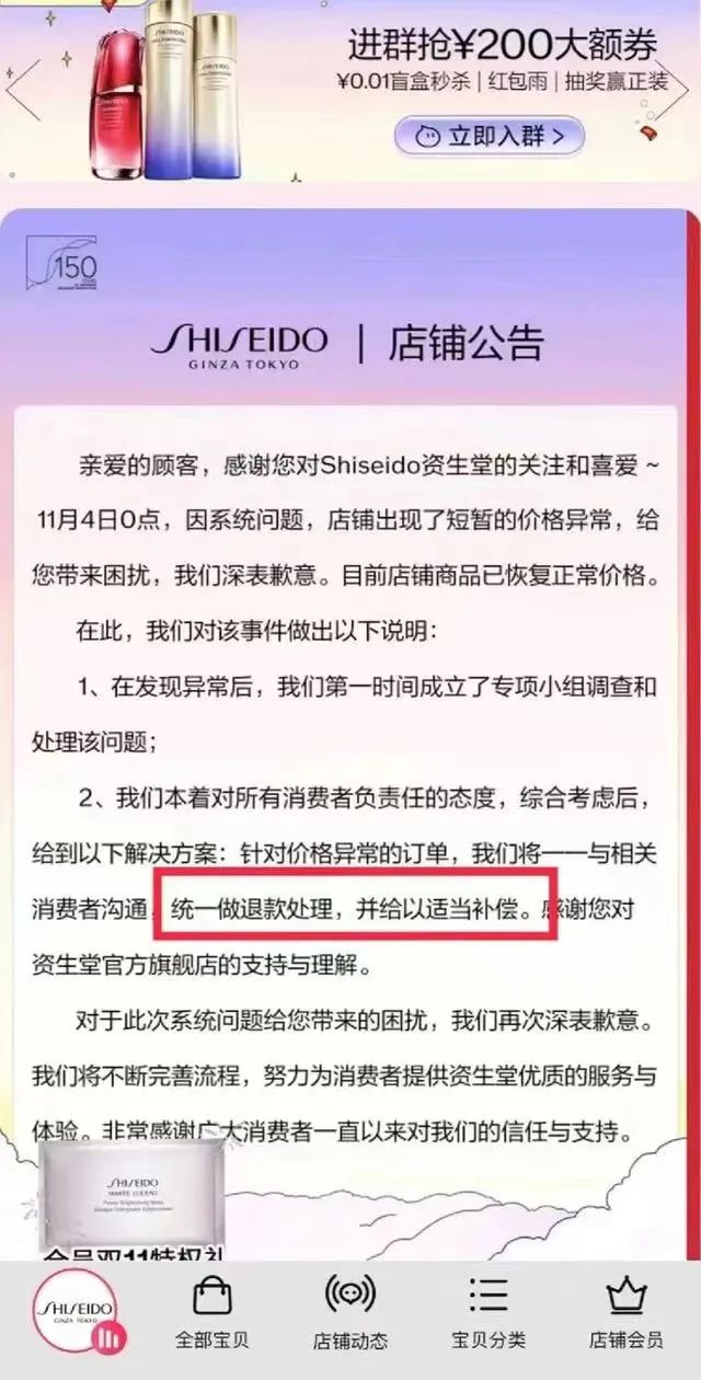 11月4日晚,资生堂旗舰店发布公告称,当日0点因系统问题,店铺出现了短暂的价格异常,针对价格异常的订单,资生堂方面将与消费者沟通,统一做退款处理,并给与适当补偿。淘宝店铺“李佳琦Austin粉丝福利社”也回应称:“目前店铺商品已恢复正常价格。针对短时内交易的价格异常订单,品牌将统一做退款处理。”