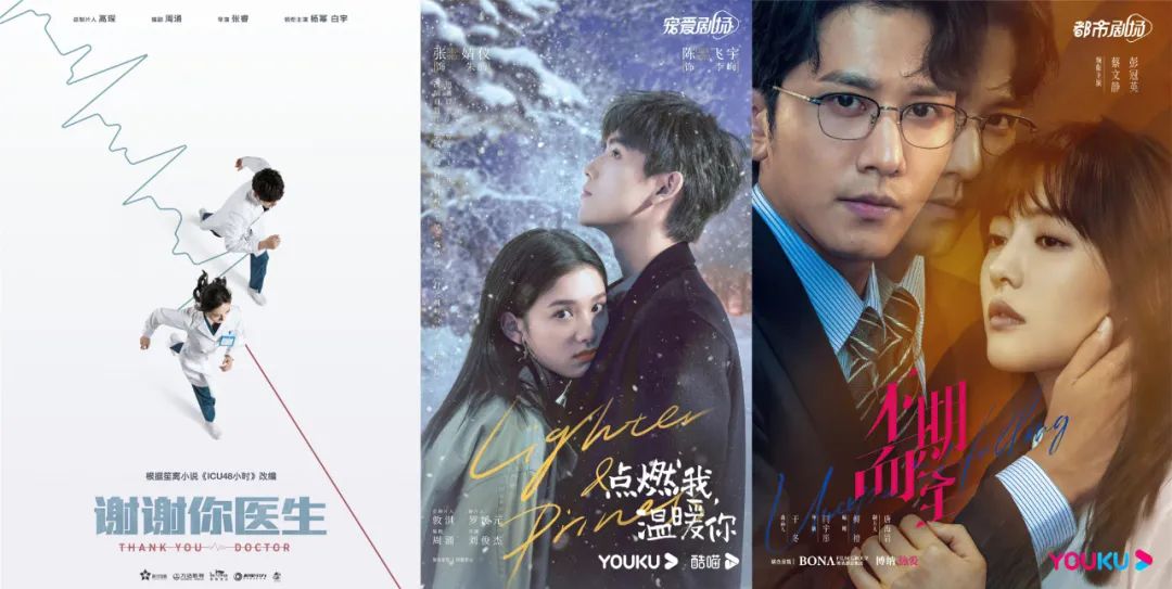 其中优酷独播、已经拿下了若干个热度榜一的《点燃我,温暖你》,就是阿里影业敦淇工作室开发的;而至今稳定在热度榜前二的台网剧《谢谢你医生》,万达影视和新媒诚品都是该剧的出品方。