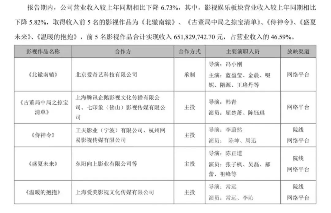 但可以肯定,在寒冬期加疫情的影响下,各家坚持发力剧集的动作还将持续下去。尤其是这方面业务已经给各公司带来了较好的收益,以华谊为例,去年取得收入排名前二的作品分别为《北辙南辕》和《古董局中局之掠宝清单》。