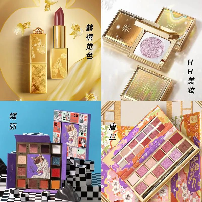 以上四个品牌中,鹤禧觉色与故宫IP合作,是比较典型的“宫廷风”品牌;HH美妆则也同样借鉴了中国精致的鎏金艺术品的质感,叠加了白瓷的元素打造产品;而帼弥和唐旦相对来说较为特殊一些,前者的明星产品十二色眼影盘借鉴了国潮百鬼夜行的风格,图案有鬼怪世界之感,每个颜色皆有其独特命名,例如罗网、虚妄、囚等,后者的产品设计则有明显的大唐风格,色彩鲜艳靓丽,部分产品还与敦煌风格类似。