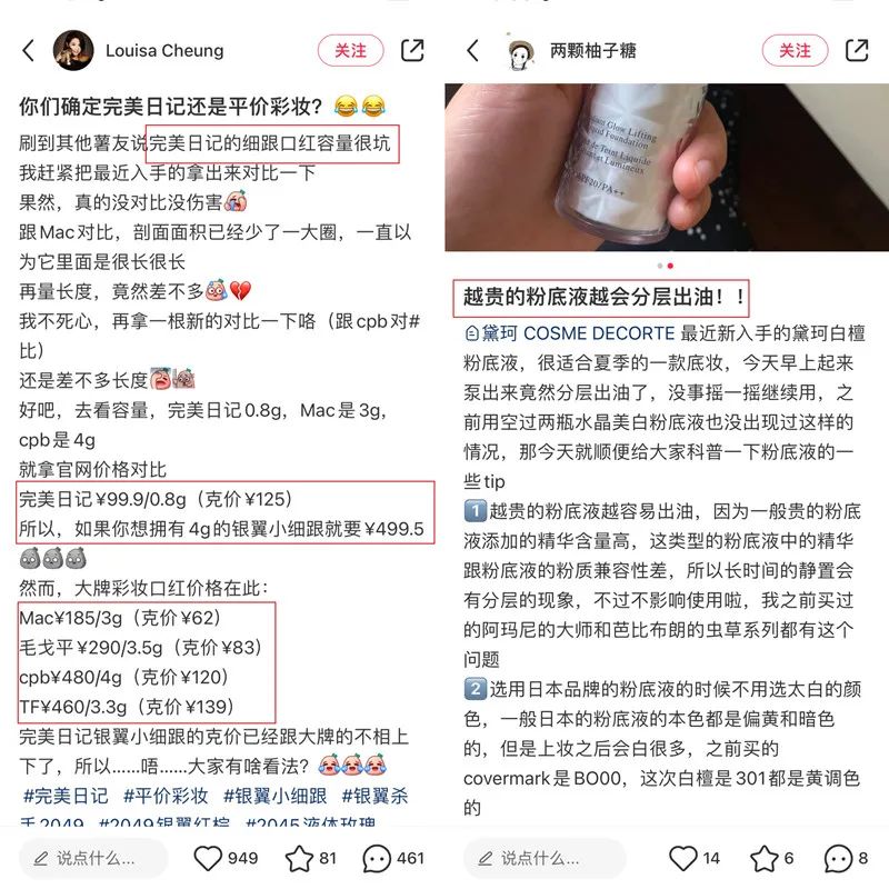 从上图中也能看出消费者对于国货彩妆的苛刻程度,以g为单位对比价格、以价格贵贱简单定义产品好差,都使得小众国风彩妆的生存举步维艰。消费市场是残酷的,不论是配方还是成分,想要取得消费者认可的新锐国货彩妆的每一步都需要小心翼翼。当下,消费者对于国货彩妆的刻板印象是新锐彩妆品牌怕行差踏错的重要原因。
