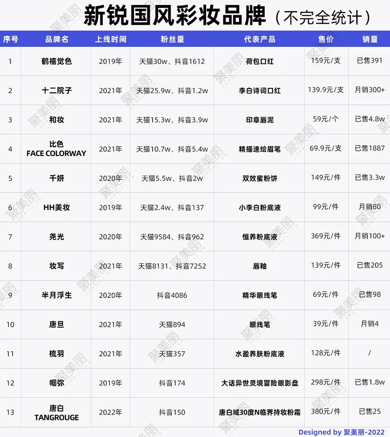 聚美丽经过整理发现,近几年涌现的初创国风彩妆品牌数量至少有两位数,虽然都是中国风的品牌,但也各有特色,我们粗略地将其归为三类: