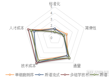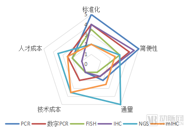 技术能成功应用于临床需要满足一些特性。首先是临床相关性、灵敏性、稳定性这些基本特征,除此之外,还要满足一些特征才能广泛应用于临床。我们通过专家调研选取了5个指标,分别是标准化、简便性、通量、技术成本、人才成本。其中,标准化指技术的注册获批规则的完善程度,简便性指技术是否容易操作。