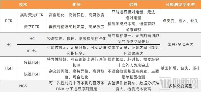 IHC在研究指标上比较单一,目前多重荧光免疫组化(mIHC)可实现7-9种标志物的染色;FISH技术检测时间长,目前快速FISH技术可将杂交时间由最低8h缩短到2h。上述技术各有特点,在应用上相互补充。我们对这些技术的特点做了梳理如下: