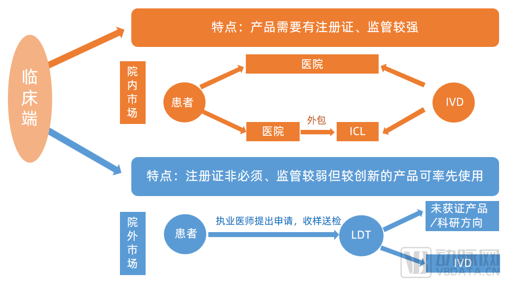 伴随诊断产品进入临床端有两种模式:院内模式和院外模式,一般意义上,两者的区别在于产品是否获批,获批了可以以IVD试剂的形式进院,未获批则只能以LDT服务的形式在院外开展,具体模式如下: