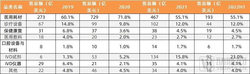 2019-2022年上半年我国医疗器械出口各品类情况(图片来源:蛋壳研究院)
