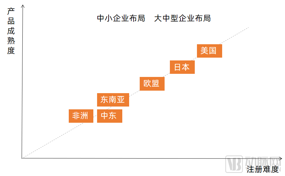 就出海的目的地来说,企业主要考虑的因素是注册难度和产品成熟度,其中,注册难度和产品成熟度呈正相关。就美国、日本、欧洲、中东、东南亚、非洲这几个市场来说,我们从产品成熟度和注册难度角度分析如下: