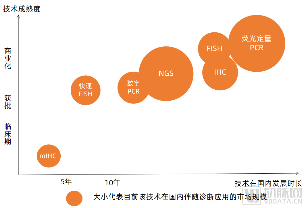 我们对上述技术根据成熟度、在国内发展时长和目前在伴随诊断领域市场规模做出分析如下: